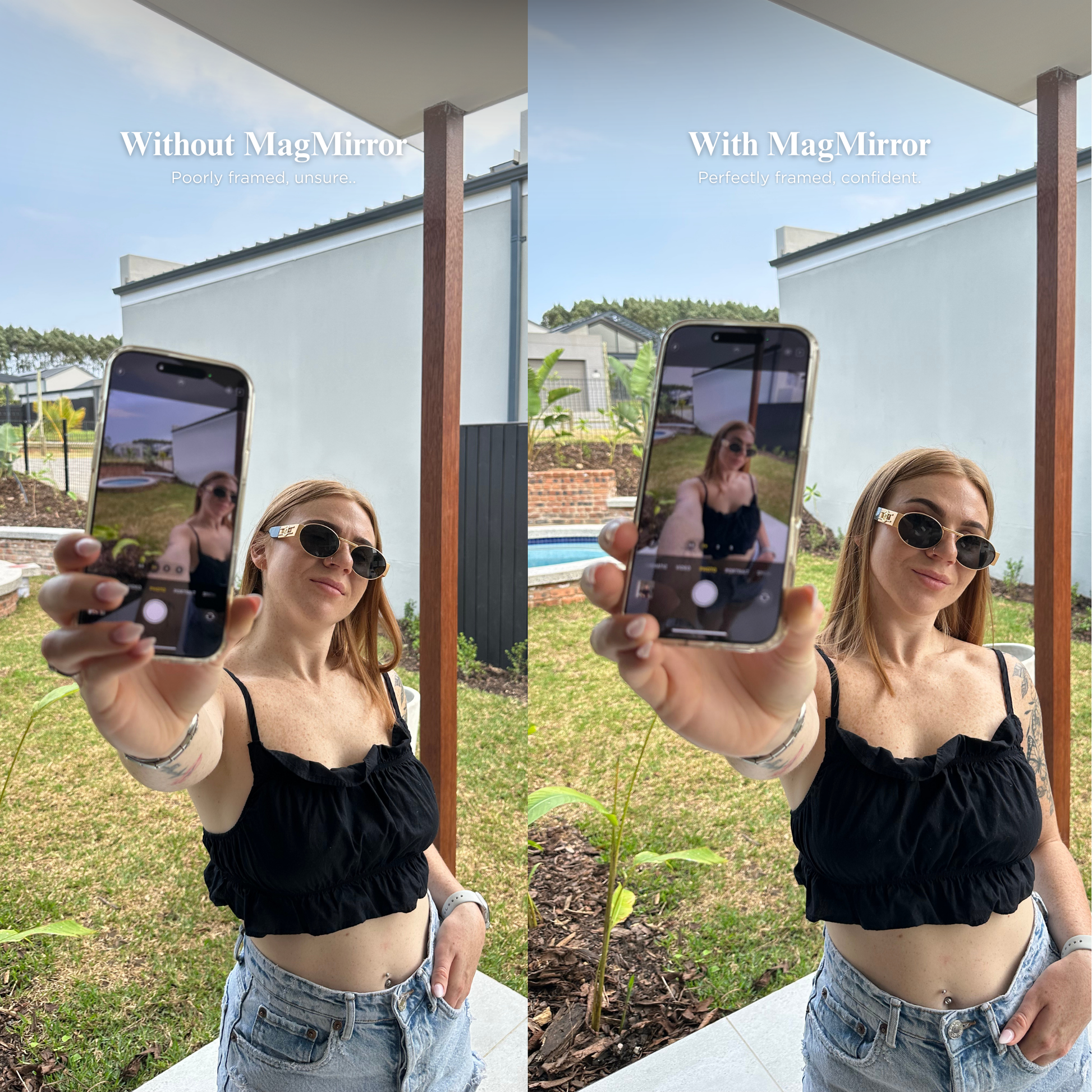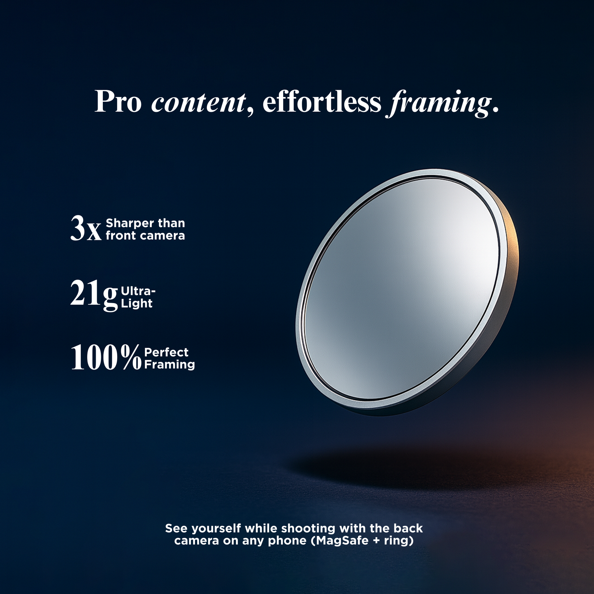 The magnetic mirror that lets you use your superior back camera, with perfect framing every time.